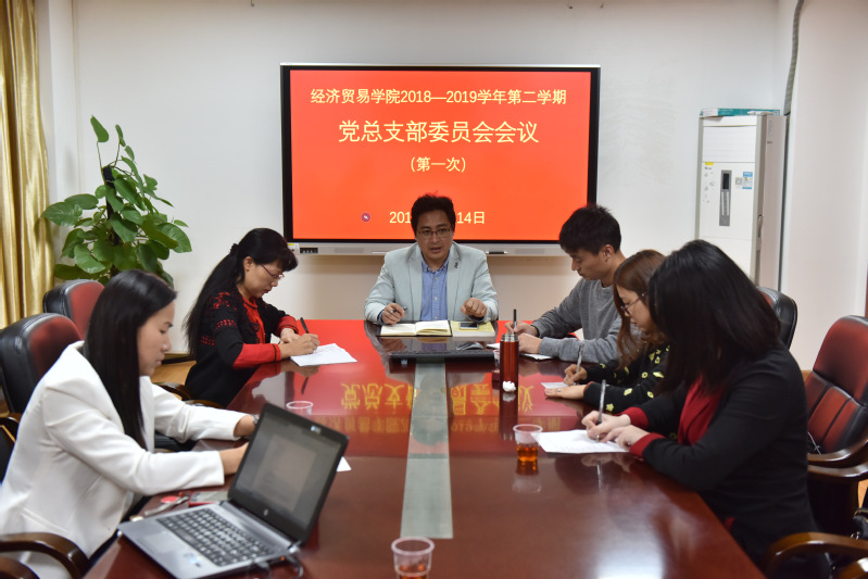 为深入学习贯彻习近平新时代中国特色社会主义思想和党的十九大精神,进一步严格落实“三会一课”制度,3月14日上午,经济贸易学院党总支在学校第一会议室召开新学期首次支委会。会议由副书记(主持工作)王坤明同志主持,副书记邱秀芳同志、副书记龚云同志、纪检委员廖晓虹同志、组织委员蒋晶同志、青年委员廖文芳同志参加会议。