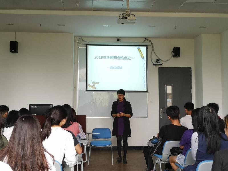 邱秀芳讲授的专题是“幸福都是奋斗出来的”,她指出:幸福离不开我们每个人的艰苦奋斗。于个人,这是迈向成功的箴言;于国家,这是创造伟业的信言;于民族,这是实现梦想的宣言。要创造美好生活、得到幸福,必须不懈地奋斗,而奋斗本身就是一种幸福,只有奋斗的人生才称得上幸福的人生。同时,邱秀芳还引用了全国人大代表米雪梅以及马化腾、马云、刘强东和董明珠等社会名人的亲身经历,深度阐述了幸福与个人学习、工作的关系,表明奋斗的过程中必须一步一个脚印,踏踏实实做事。中国特色社会主义的奋斗目标是在本世纪中叶,把我国建设成为富强民主文明和谐美丽的社会主义现代化强国,从十九大到二十大,是“两个一百年”奋斗目标的历史交汇期,全面建成小康社会进入了倒计时,在这样一个极其重要的时间节点,“奋斗”二字尤为响亮,尤为鼓舞人心。邱秀芳还引出了2019年全国两会热词“脱贫攻坚战”,她指出,没有农村的小康,特别是没有贫困地区的小康,就没有全面建成小康社会。如今,脱贫攻坚战的冲锋号已经吹响,经济贸易学院为响应这一号召,做了一系列的精准扶贫项目,为国家的脱贫攻坚贡献力量。