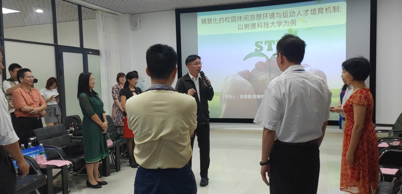 台湾树德科技大学徐振德老师带来的分享主题是《精致化的校园休息环境与运动人才培养机制》,他别开生面地从带领老师们做放松运动开始,介绍了树德科技大学以精心打造校园专业运动设施、着力培养专业运动人才的特色育人体系。