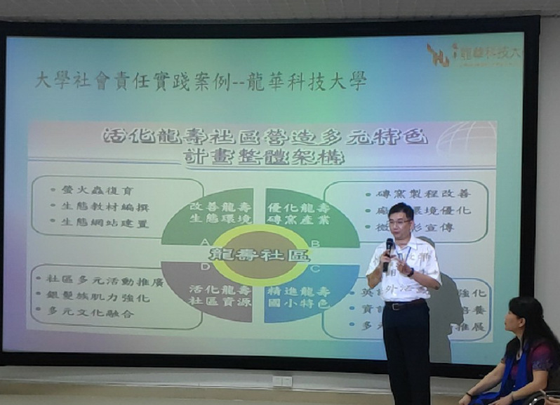 台湾龙华科技大学施教旺教授分享的主题是《大学社会责任实践与教师价值》。他从探讨大学社会责任相关学术理论着手,介绍了本校社会责任实践案例——活化龙寿社区营造多元特色计划。该计划将改善当地生态环境、社区多元活动推广、助教偏乡小学等社会实践活动整合起来,带领学生进行社会实践,引导学生正确面对社会问题。