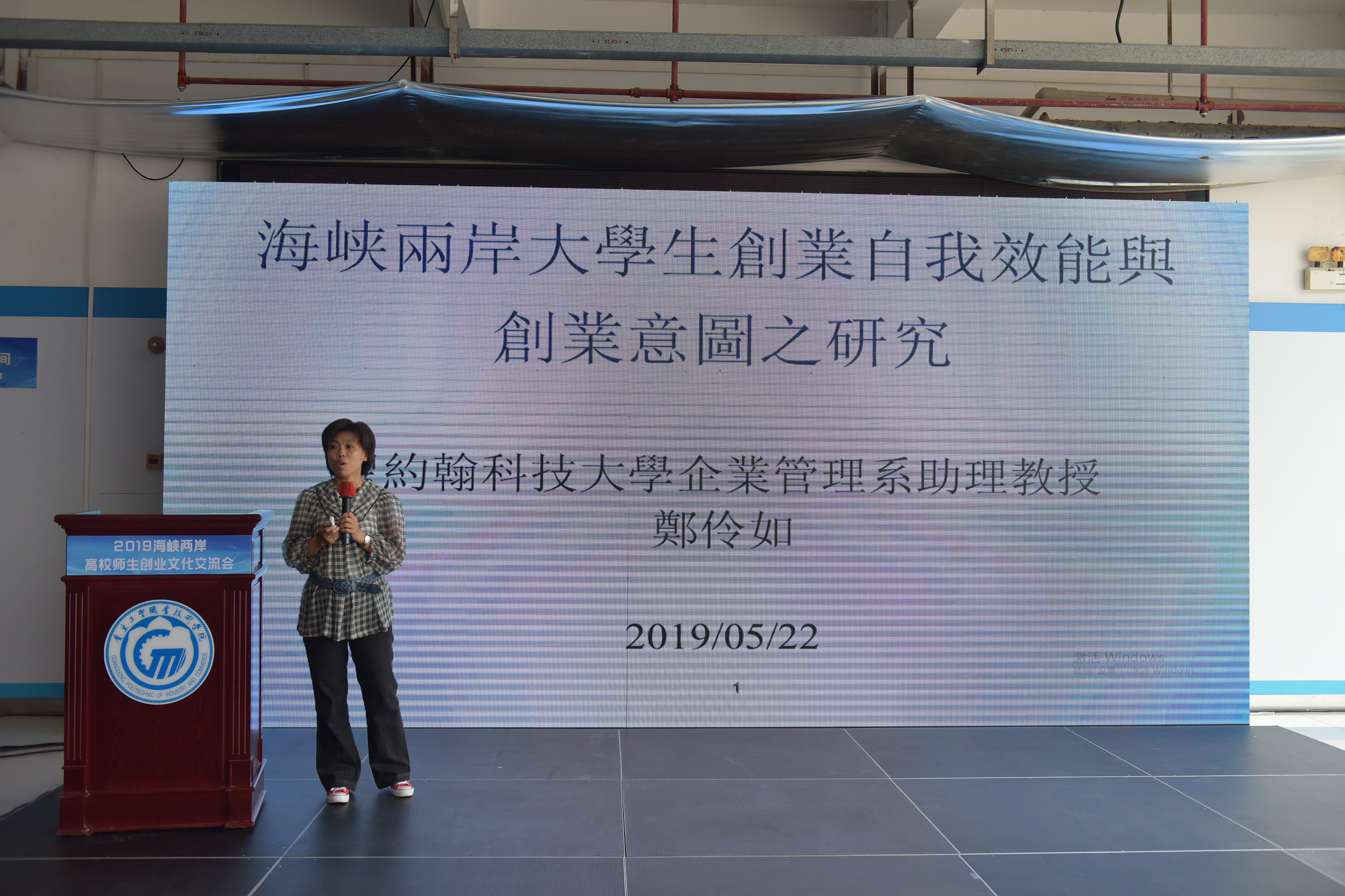 交流会高校代表发言环节,首先由台湾圣约翰科技大学郑伶如老师作《两岸大学生创业自我效能与创业意图之研究》主题发言。她从学术理论的角度分析大学生创业效能与意图,并介绍了相关理论应用于实践的方法。