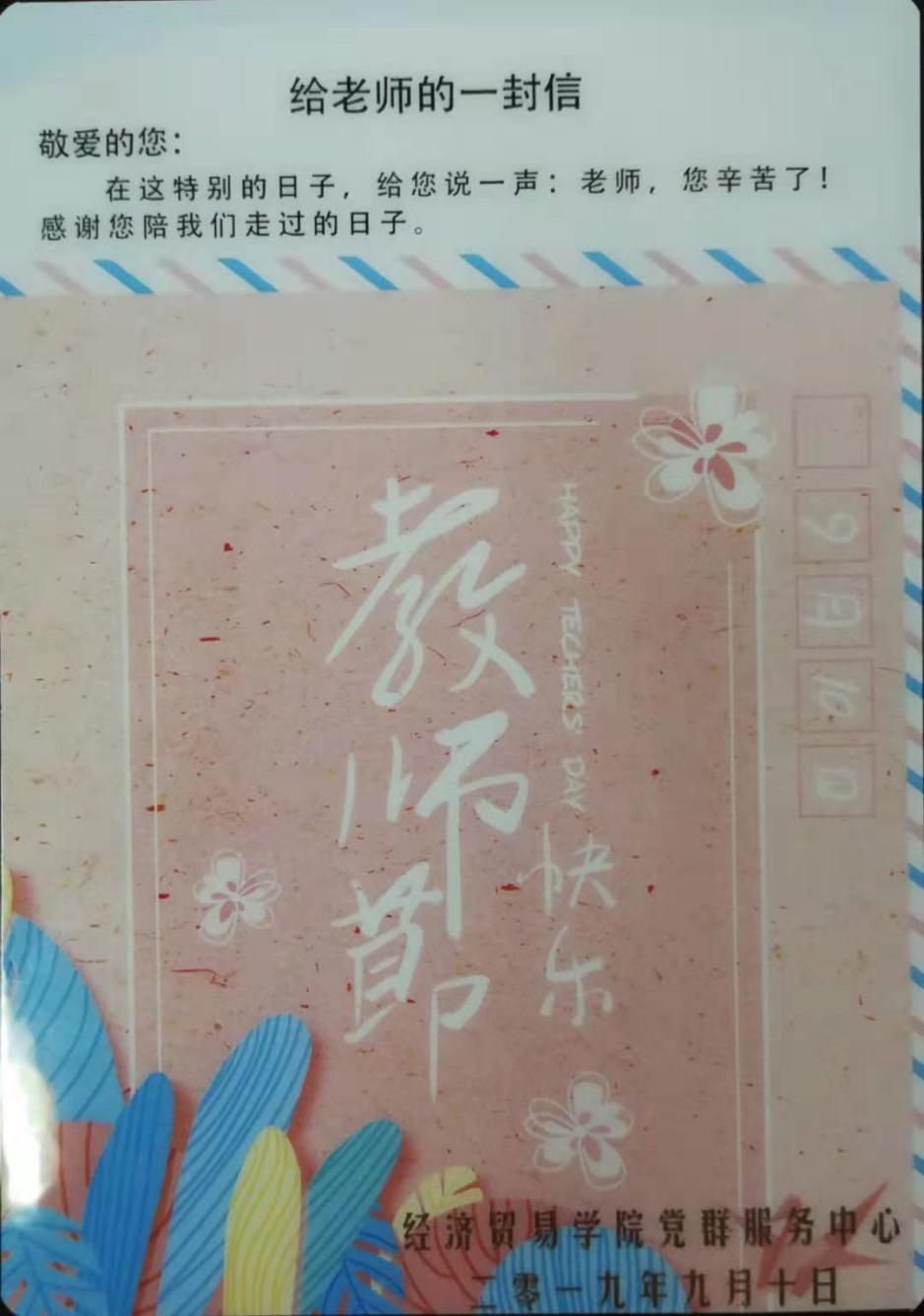 在这金秋送爽的丰收季节里,我们迎来了第三十五个教师节,经贸学院师生开展“庆祝新中国七十华诞,弘扬新时代尊师风尚”主题活动。来自60后、70后、80后、90后的老师们纷纷发表感言,来自00后的同学们,为辛勤工作的老师们送上精心制作的贺卡。
