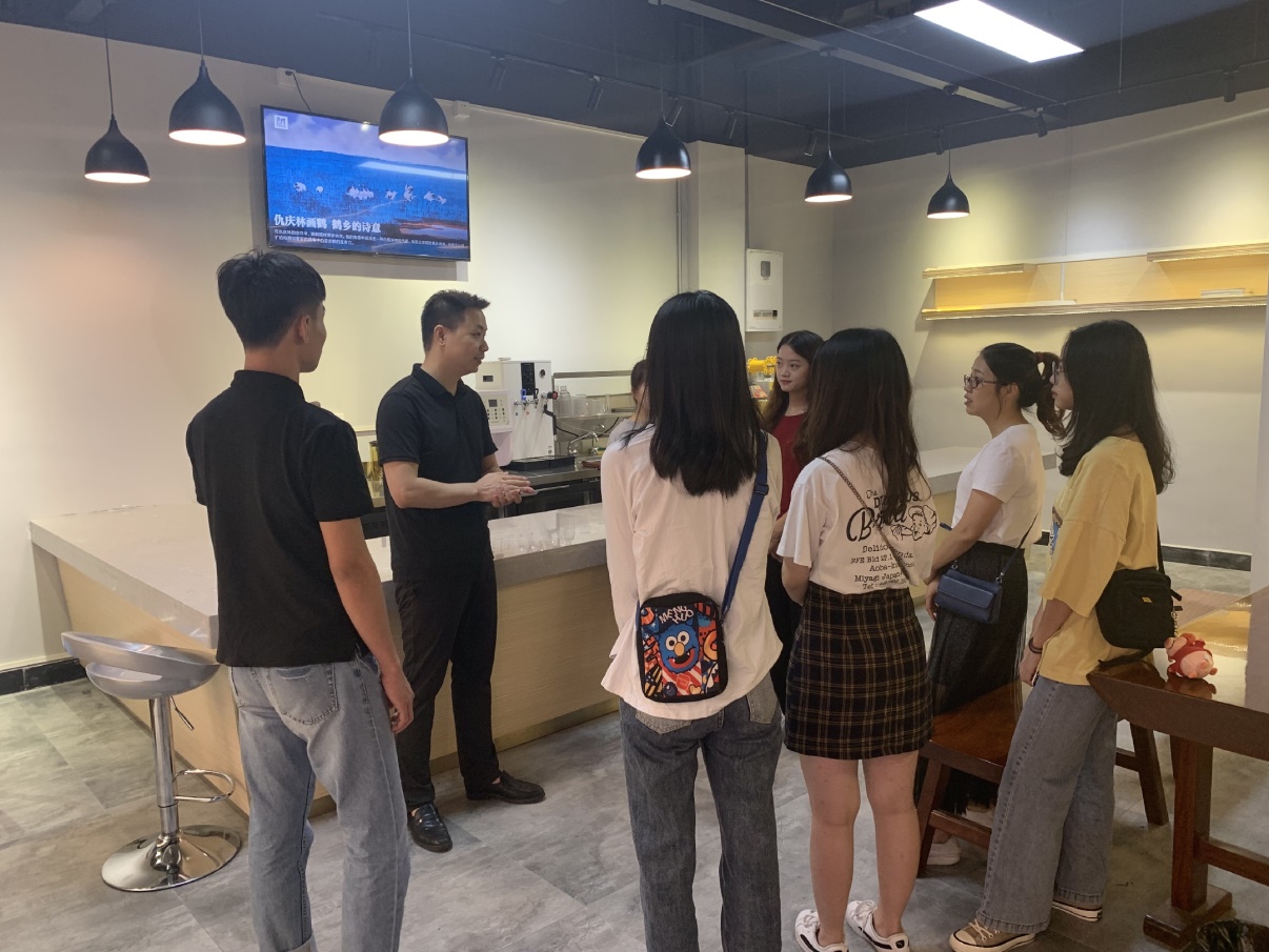 当日早上十点左右,我们在梁老师的带领下,先参观了公司旗下一个奶茶品牌终端门店样板,并向同学们介绍了终端门店提供的服务,包括产品定制、饮品培训、开店支持和策划设计等业务,方便创业者的进入。