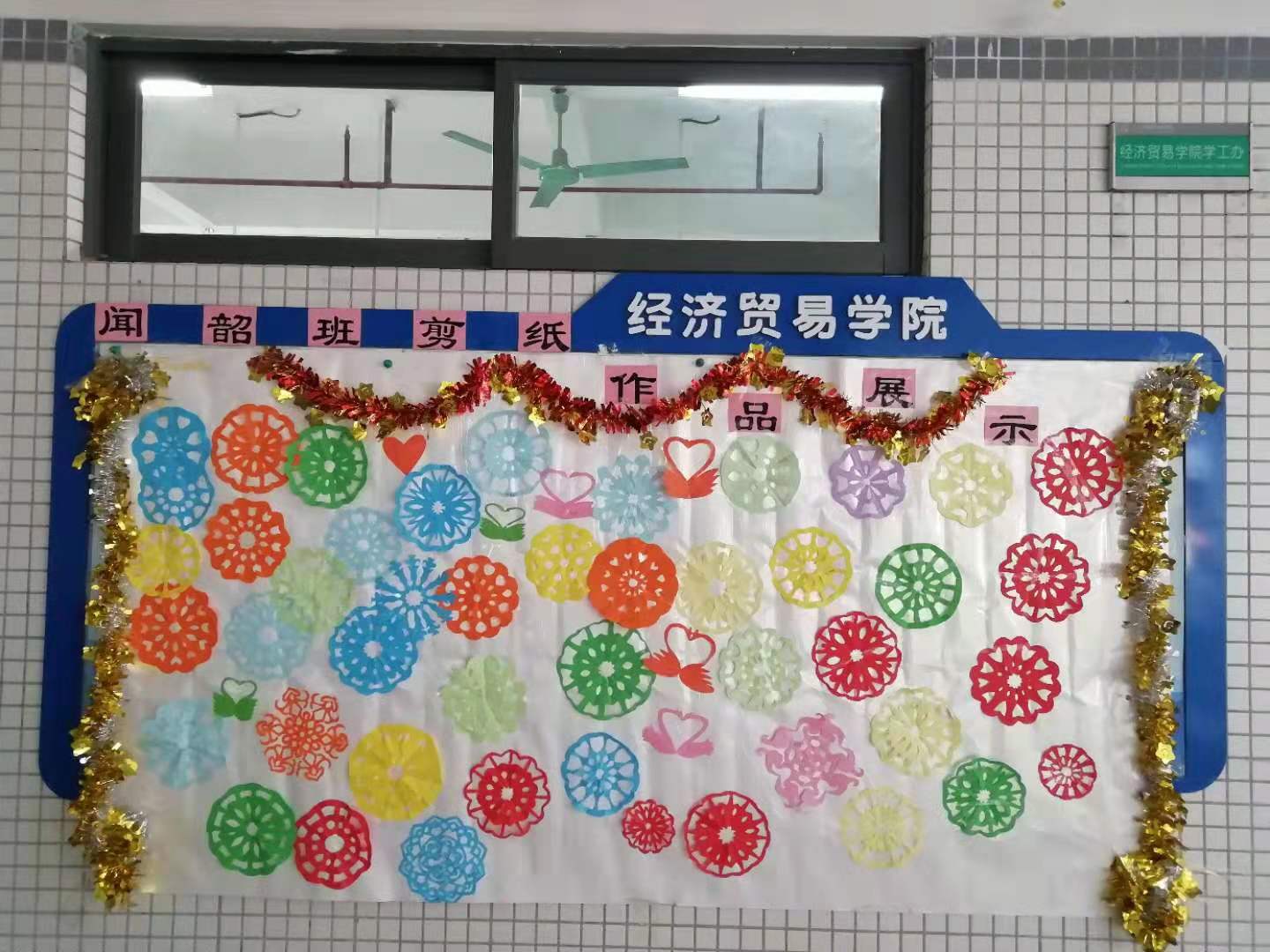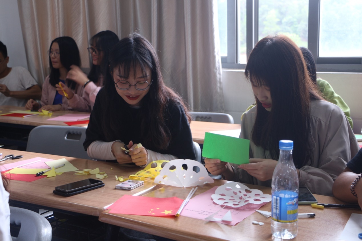 全体师生进行剪纸、剪窗花活动。 一张张彩色的纸在一双双巧手来回的折叠,一把把剪刀轻轻裁出一幅幅精美的图案。