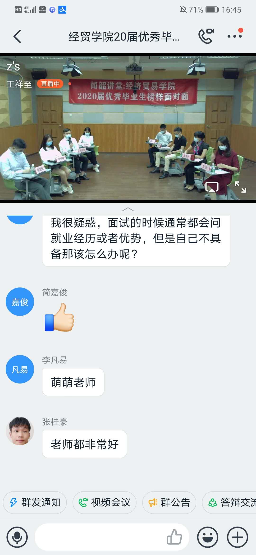 此次访谈还设立了在线提问环节,经贸学院的学弟学妹们以超乎寻常的热情不断向榜样提问。例如,如何规划自己的大学生活?三年大学时光应该努力追求些什么?怎样合理分配时间?如何才能找到适合自己的工作?怎么学好英语,通过四六级?你最喜欢的老师是哪一位?如何维护同学间的人际关系?以及关于升学和就业等各种具体问题……4位优秀毕业生代表分别给予了真诚、细致、耐心的解答。