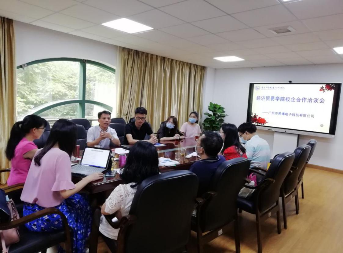 为推进我院校企合作建设进一步开展,2020年7月1日下午,由广州市昇博电子科技有限公司董事长廖振雄等4人组成的企业访问代表到访我校,经贸学院院长邱秀芳教授、副院长方洁教授、办公室主任邓彩云、商贸系主任蒋晶、营销系主任严琳、国际贸易专业带头人李政敏、电子商务专业带头人方文超一起参加了交流,双方就校企合作工作进行了热烈的洽谈。