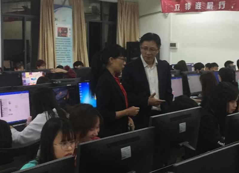 在实训期间,学校副校长刘贻新来到学生实训现场开展指导工作,学院院长邱秀芳教授和电子商务专业教师李波老师等陪同。
