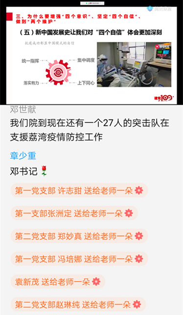 会上共建单位广州市老人院党委书记邓世献同志就课中疫情防控内容结合当前广州市疫情实际在线互动发言,“广州市老人院目前有27人组成突击队驰援在荔湾疫情防控一线中,当前疫情防控工作稳步进行,得到有效控制,这是我们发挥中国特色社会主义制度优势、坚定‘四个自信’的必然结果”。