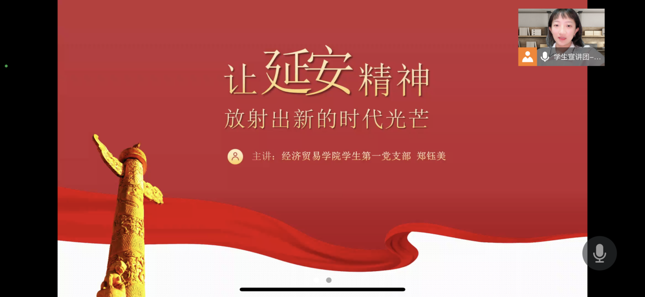 8月16日晚上,校学生党史宣讲团成员郑钰美同学在经贸学院20营销6班开展线上党史宣讲活动,学习了习近平总书记在庆祝中国共产党成立100周年大会上的重要讲话精神和延安精神,全体同学参加了学习,受益颇深。