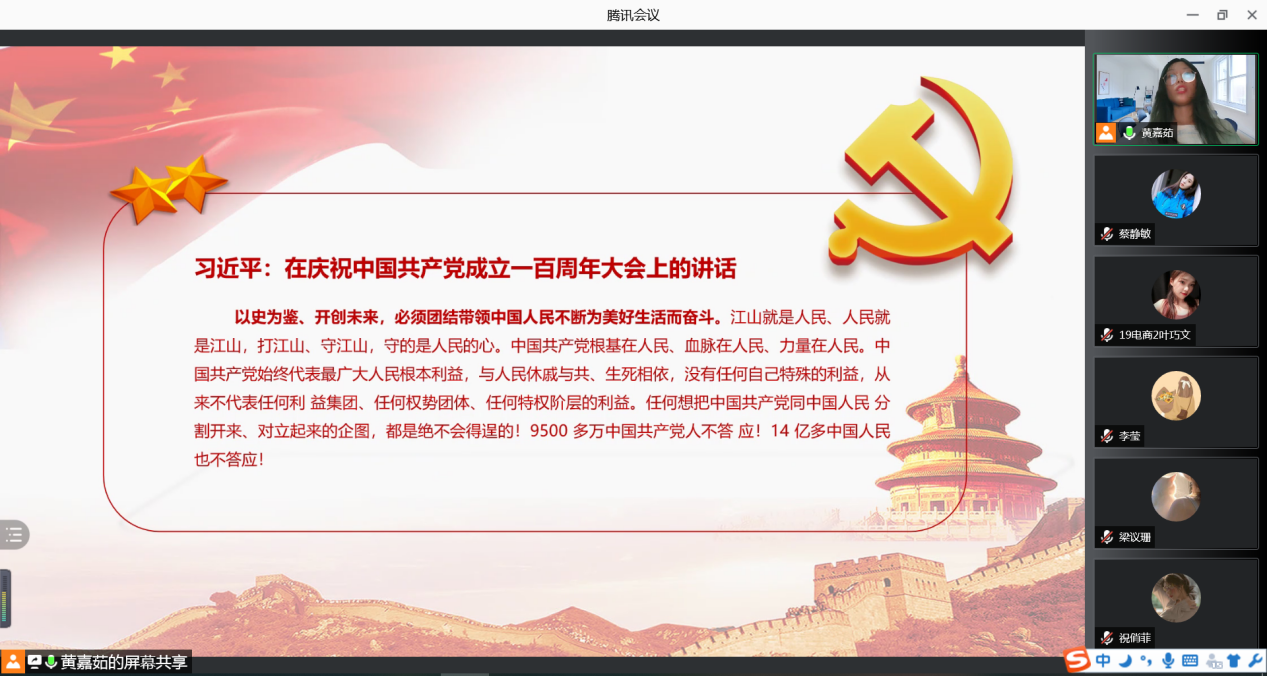 团结是中国人民和中华民族战胜前进道路上一切风险挑战、不断从胜利走向新的胜利的重要保证。黄嘉茹同学向我们分享了习近平总书记激励两岸同胞在内的所有中华儿女,团结向前,共创民族复兴美好未来;以史为鉴、开创未来,必须团结带领中国人民不断为美好生活而奋斗等习近平总书记在建党一百周年大会上的重要讲话内容的学习,引导我们领悟讲话精神,传递团结思想。在宣讲的最后,黄嘉茹同志以“新时代,新青年,新思想”为核心,激励正值新时代青春年华的我们,一是要积极响应党和国家的号召,把青春奋斗融入党和人民事业;二是要不忘初心、牢记使命;三是要坚守国家安全底线,时刻关注海峡两岸时事新闻;四是要做好新青年的“六点要求”。作为一名党员更应学会在危机中育新机,于变局中开新局,勇当时代弄潮儿。