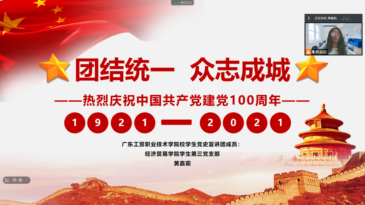 8月14日晚上,我校学生党史宣讲团成员黄嘉茹面向经济贸易学院学生第三党支部的党员同志们做《团结统一,众志成城》专题宣讲,围绕“团结统一”核心,讲述了“西安事变,石破天惊”、“习语金句,百校千言”、“新时代,新青年,新思想”等内容。
