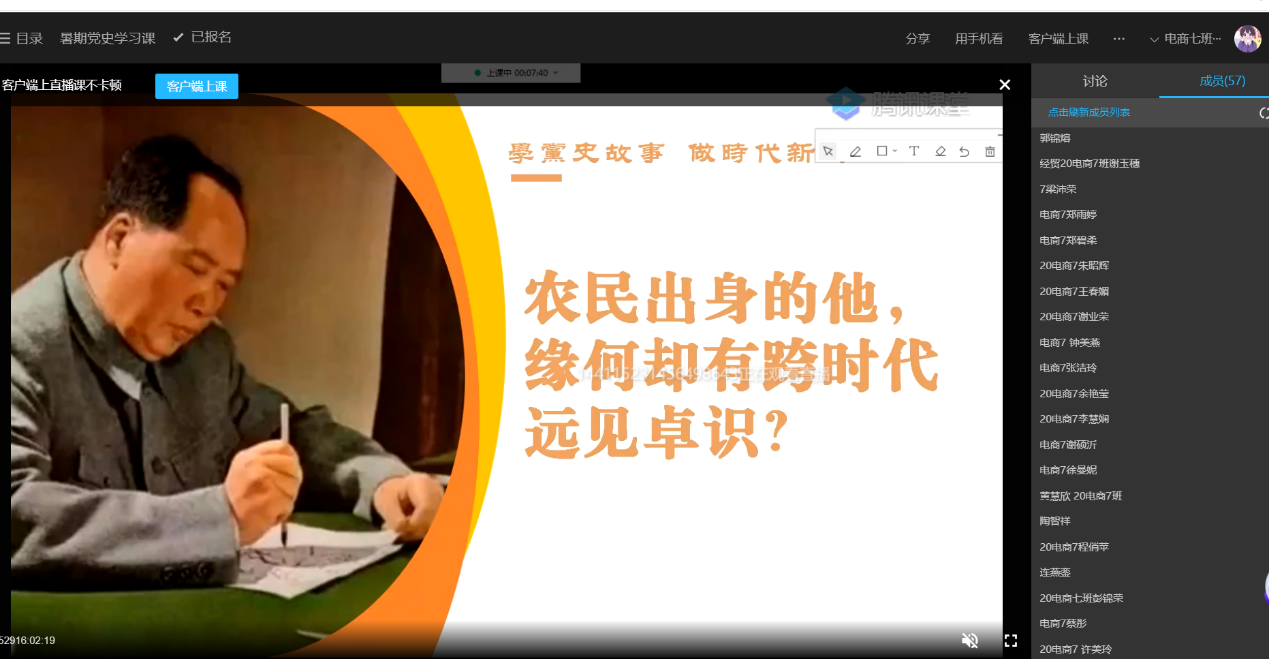 为进一步推进党史学习教育,感受新时代红色文化,提升青少年社会责任感、创新精神和实践能力,培养爱党、爱国、爱校的思想感情,利用暑假继续深入开展党史学习教育,做到暑假不停学,根据经贸学院党总支关于暑假党史学习教育的部署和要求,学院党总支书记李繁于9月1号在腾讯课堂为20电商7班的同学上了一门以《农民出身的他,缘何却有跨时代远见卓识?》为主题的党课,学党史故事,做时代新人,厚植爱国爱党情。
