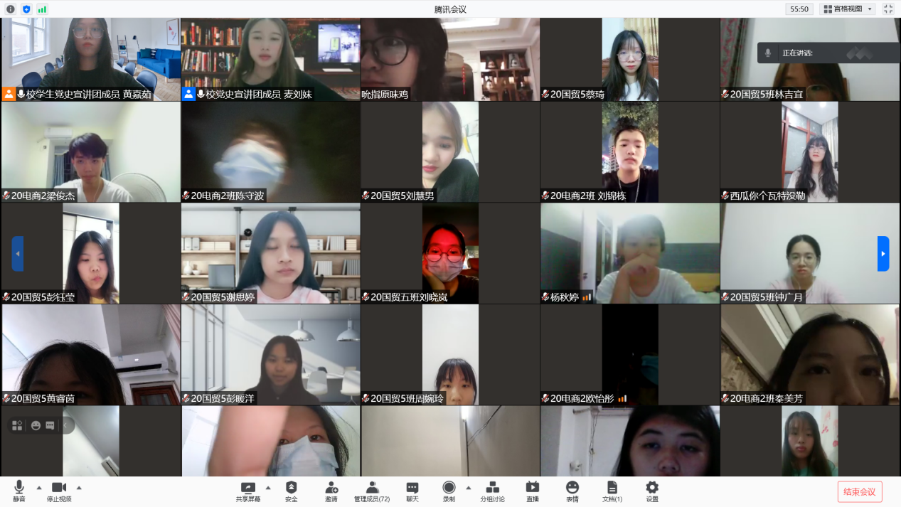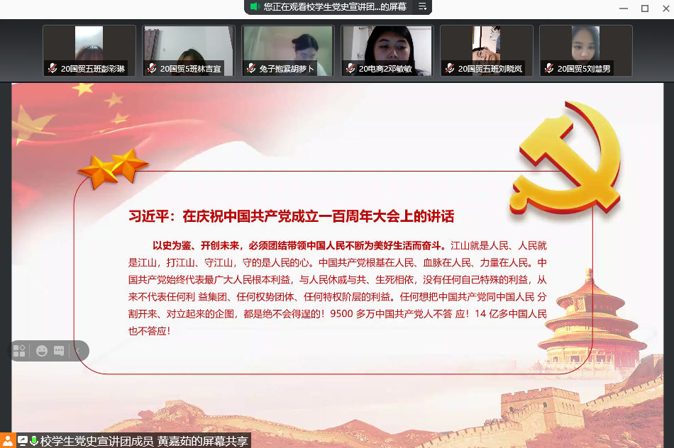 为了学习贯彻习近平总书记在庆祝中国共产党成立100周年大会上的重要讲话精神,立足中国共产党百年华诞的重大时刻和“两个一百年”历史交汇的关键节点。8月31日晚,100%精准出码规律资料网站学生党史宣讲团成员黄嘉茹同志给20电商2班团支部和20国贸5班团支部开展了线上党史专题宣讲,宣讲通过腾讯会议的方式,以“团结统一,众志成城”为主题,带领学生们共同回顾党史小片段以及学习习近平总书记在建党100周年大会上的重要讲话精神。