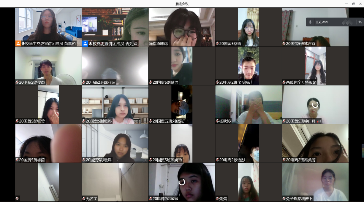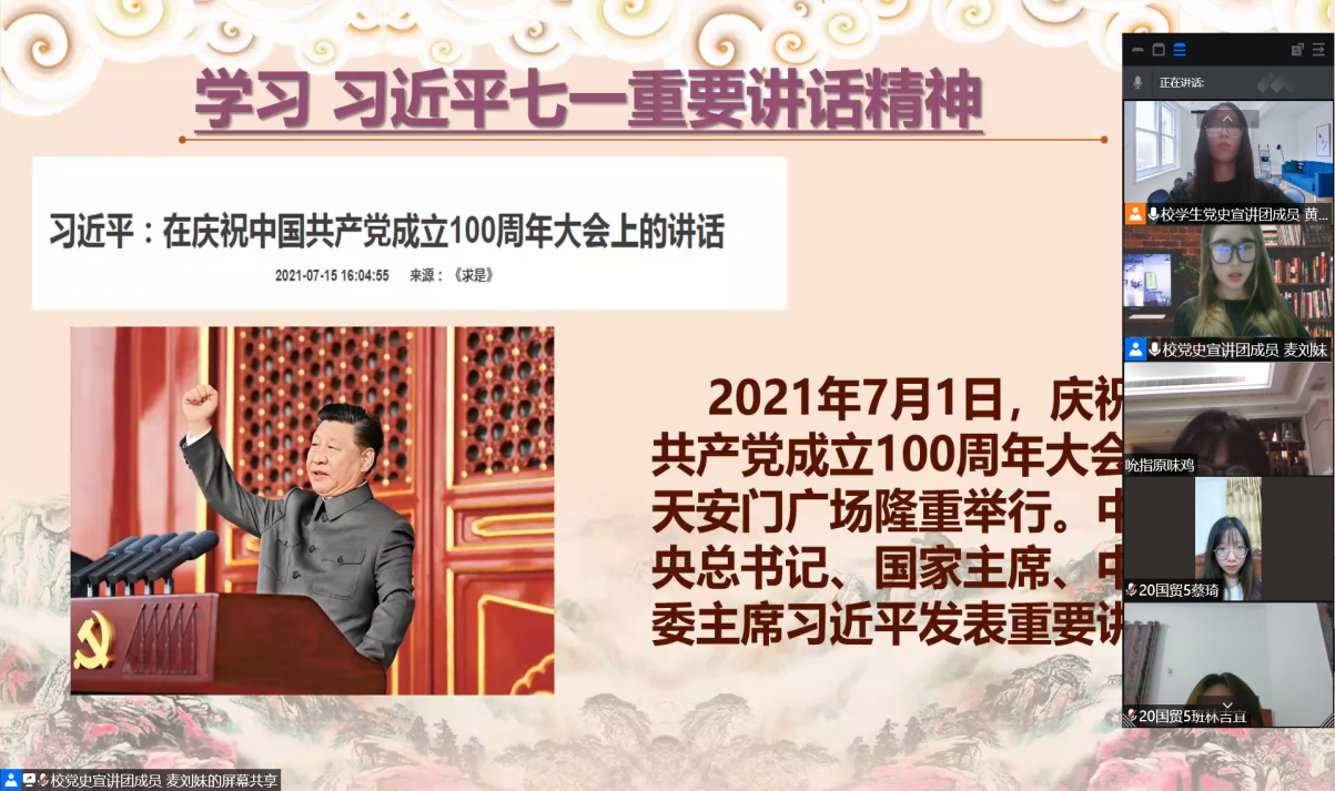 9月3日晚,校学生党史宣讲团成员19国贸5班麦刘妹同学向20国贸5班团支部和20电商2班团支部开展党史线上宣讲活动,带领学生们学习习近平总书记在建党100周年大会上的重要讲话精神及新民主主义时期的奋斗精神。