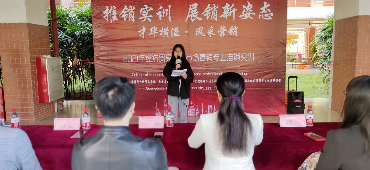 市场营销专业陈李珠同学代表全体参与实训的同学发言,表示将好好珍惜此次推销实训的机会,提升同学们自身的动手能力和团结协作能力。