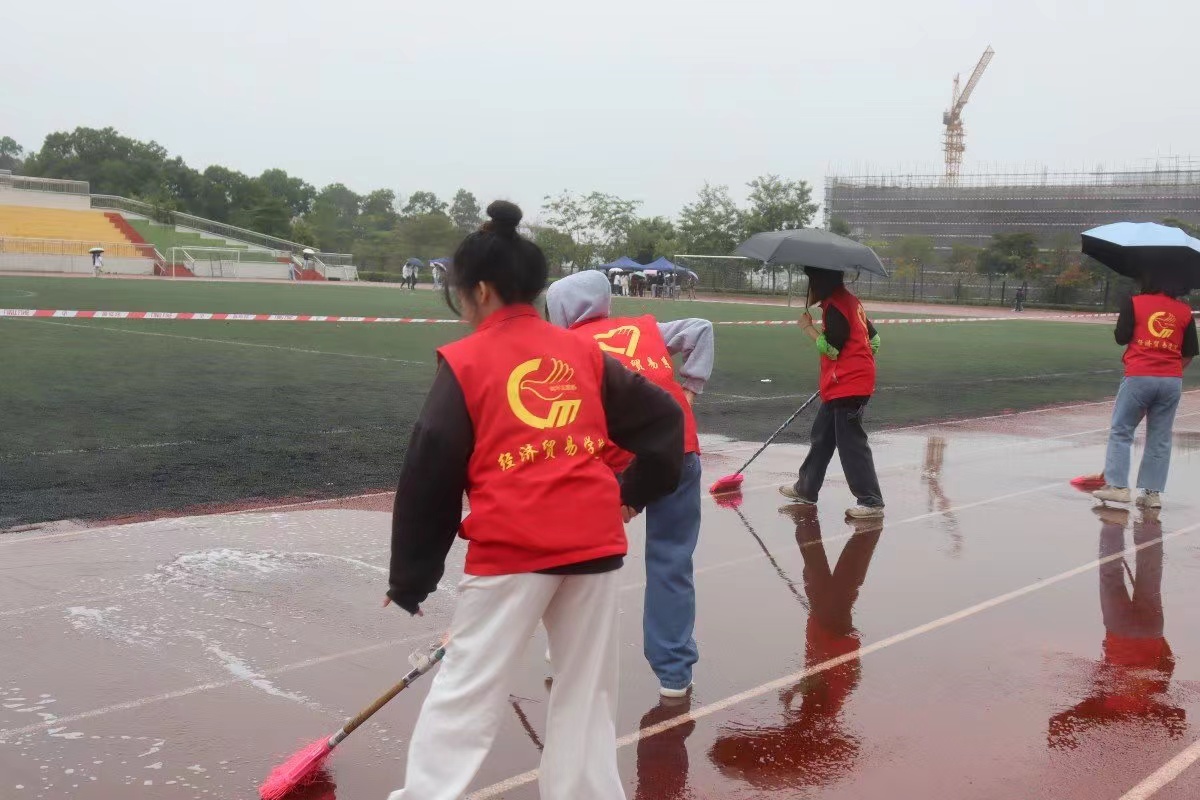 志愿者们提前到达田径场为院运会能够有序开展做前期准备,老师也参与到志愿者中帮忙清理跑道上的积水,让运动健儿有一个安全的比赛场地。