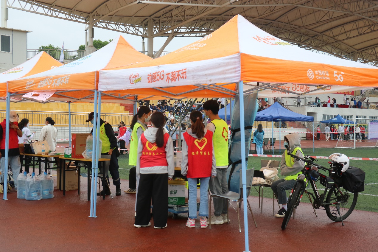 志愿者们的身影也无处不在,在终点处为运动员递上调配好的葡萄糖水,以最快的速度出现在伤员身边,无私奉献传递爱的温暖;在赛道两旁,维持秩序,为运动健儿送上真挚的鼓励。