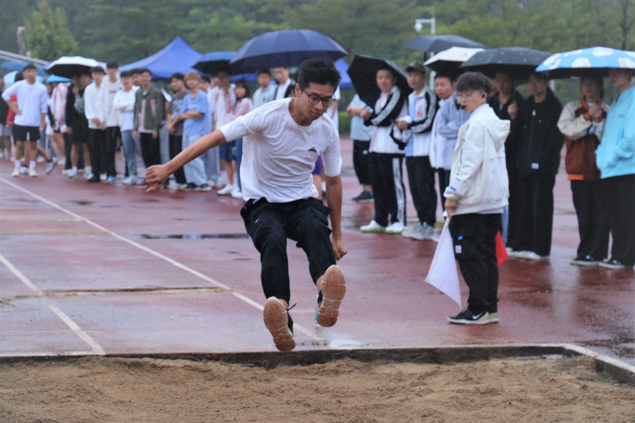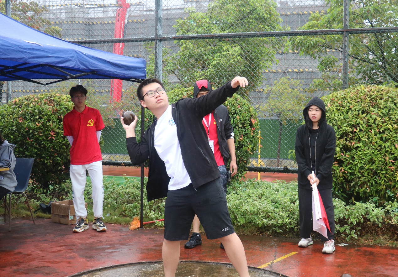 在动感的音乐和广播的通知下,跳远运动员和铅球运动员带着满身期待来到各检录点排队进行检录。萧瑟的秋风也挡不住破竹的锐气,比赛时,他们犹如脱缰的野马飞奔而去,一跃千里;他们迸发出无尽的力量,把沉甸甸的铅球抛出一道完美的抛物线。雨水朦朦,但现场欢呼声掌声接连不断,热情高涨!