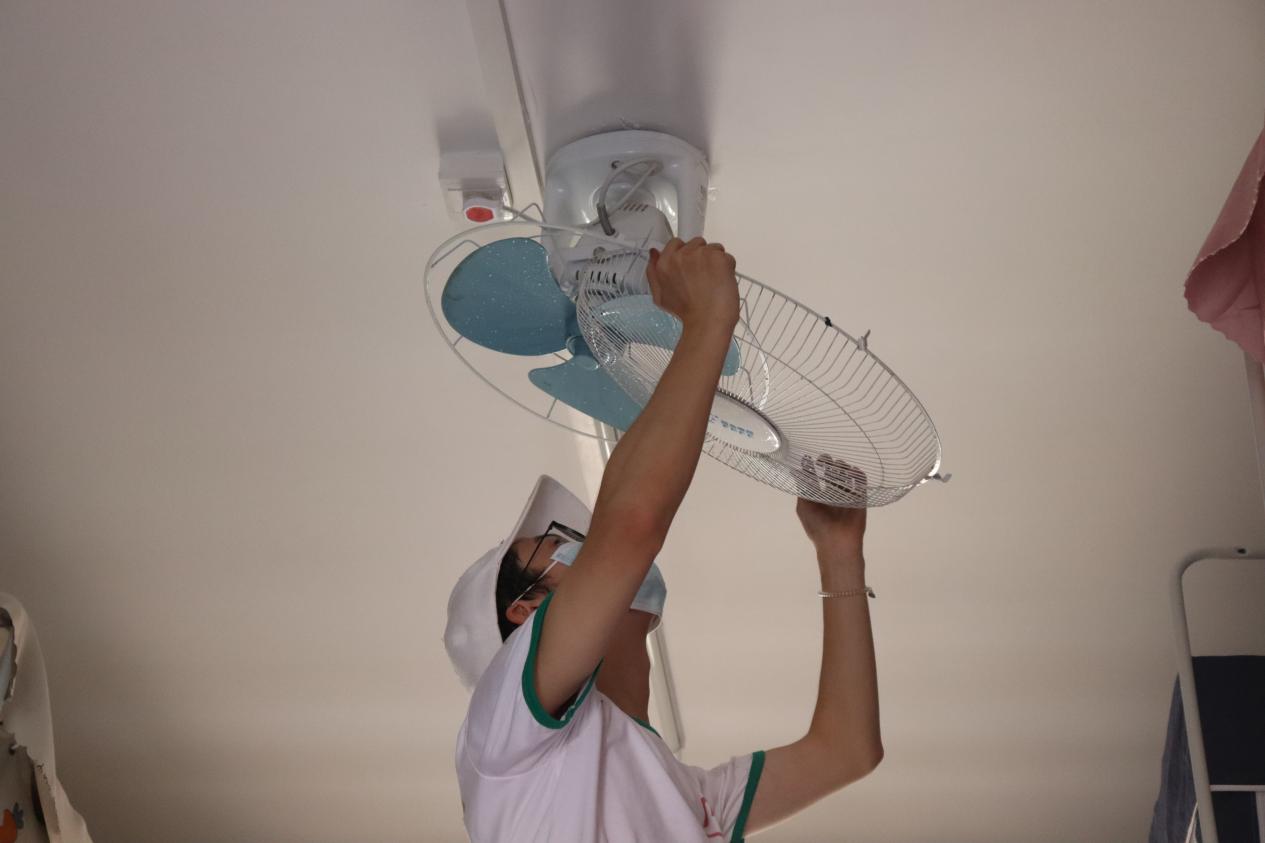 志愿者积极耐心,分工明确,不怕脏,不怕累。关闭电源、拆卸风扇、冲洗灰尘、组装调试。一切进行的井然有序,每一个细节,志愿者都尽心尽力做到最好,毫无怨言。简单而平凡的小事诠释了志愿者奉献的精神,在短短的4个小时,志愿者将布满灰尘的风扇擦洗得焕然一新。