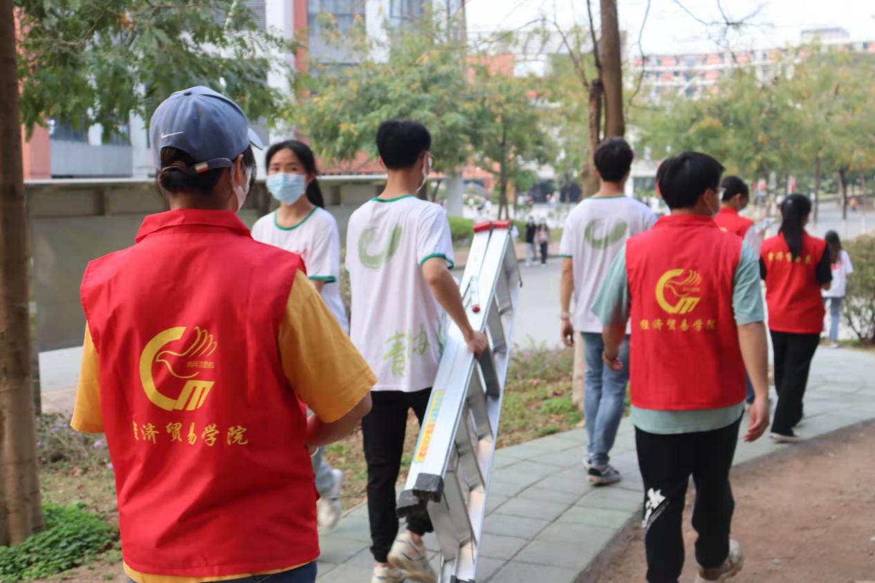 13:30活动负责人在子勤书院5号楼向志愿者讲述清洗风扇的注意事项。并由带队干事带领着志愿者前往经贸女生宿舍,志愿者身穿红色马甲,肩扛梯子,手拿抹布,在路上形成了一道靓丽的风景线。