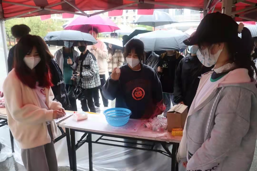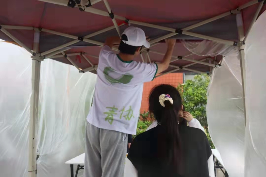 为保证活动顺利开展,工作人员在雨中不敢懈怠地抓紧布场。于14:00,在一切准备就绪后,经贸青协志愿者嘉年华终于正式开幕。