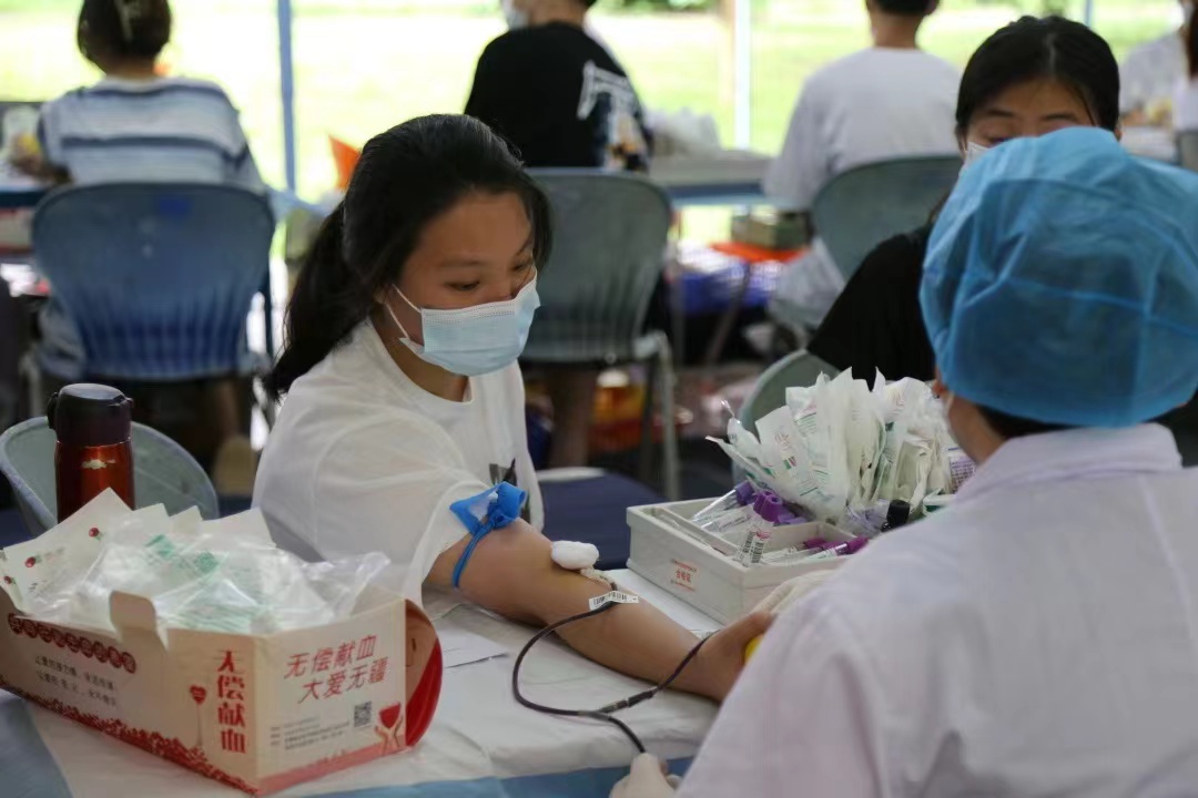 6月14日10:00爱心献血活动正式开始,志愿者为前来献血的同学们进行体温检测和血压测量,并协助献血者进行个人信息的录入。进行完验血流程的同学们在等候区等待叫号,等候区的志愿者为献血者送上葡萄糖水和小面包,让每一位献血者补充能量。献出去的每一滴血都是一份拯救他人生命的希望,每一名献血者都在用自己的一份力量去筑起爱心的港湾,用奉献精神去保护所有被需要的人。