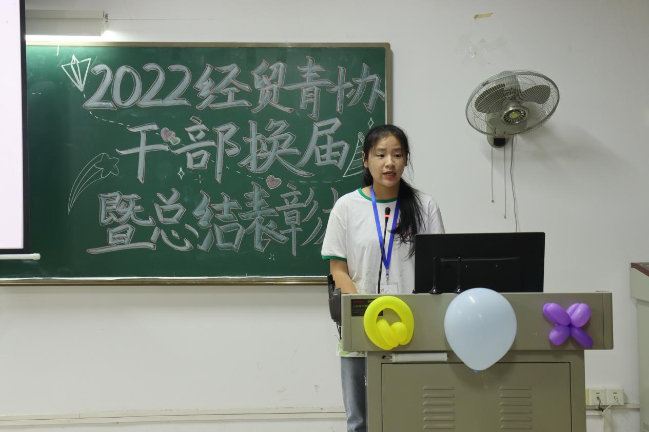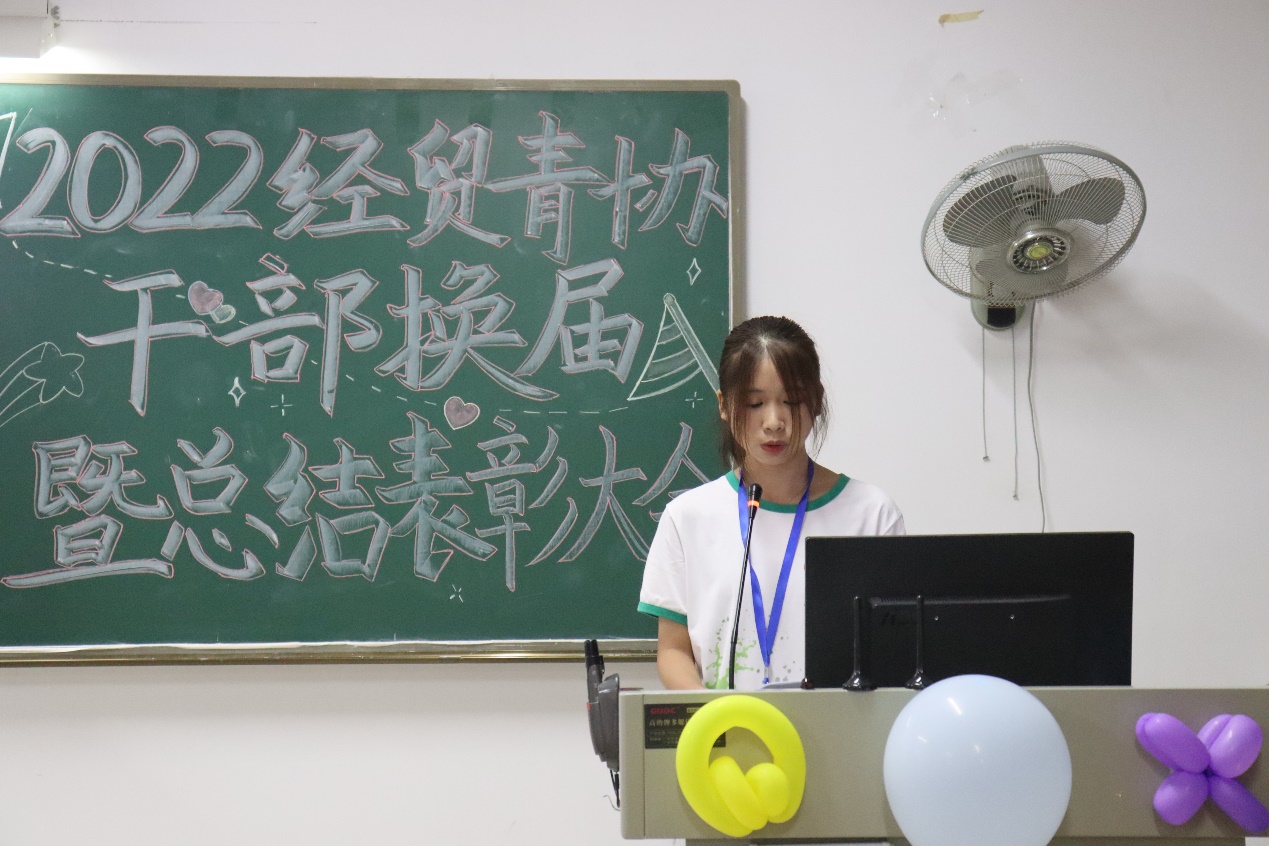 19:30由主持人杨子凡宣布大会正式开始并介绍到场嘉宾。随后20级副会长陈伟红作工作总结,回顾了经贸青协过去一年的工作进程,同时希望新一届干部及干事能在组织里积极开拓和创新。