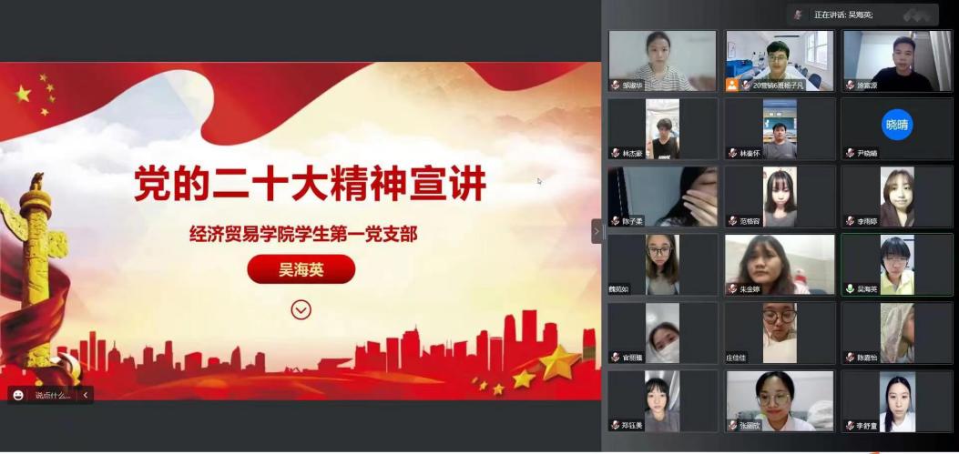 为了学习宣传贯彻党的二十大精神,12月4日,学校党的二十大宣讲团成员、经济贸易学院学生第一党支部书记吴海英在支部开展了党的二十大精神宣讲活动。