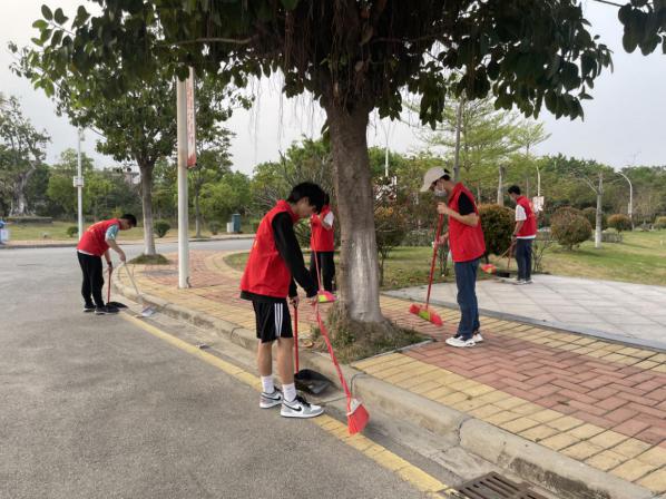 在炎热的下午,同学们手拿扫把、簸箕等工具,沿着湖边道路跟两边草坪进行清理,清扫地上的烟头,树上掉落的枯叶。充分发挥了我想做,我去做,我愿意做的积极思想。经过大家的团结协作,干净整洁的校园再次映入在眼帘。