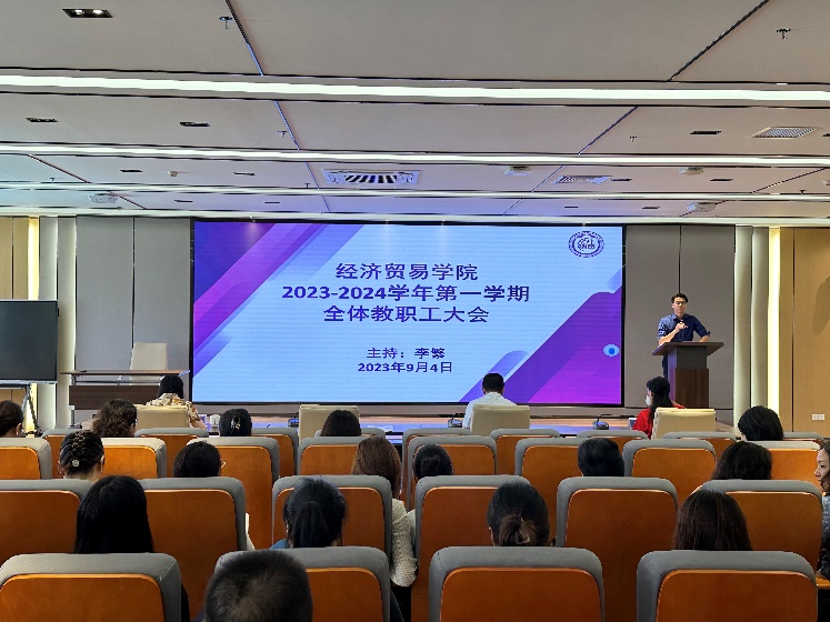 金秋送爽团结奋进结硕果,天高云淡抖擞精神启新航。为认真学习贯彻习近平新时代中国特色社会主义思想,进一步明晰新学期规划,开新局、谋新篇,确保各项工作有序开展,202394日上午,经济贸易学院2023-2024学年第一学期全体教职工大会在白云校区图书信息楼629会议室召开,党委委员、副校长唐毓秋及经贸学院全体教职工出席会议。会议由经贸学院党总支书记李繁主持。