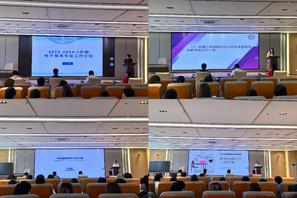 会上,方文超、蒋晶、黄华乾及陈建兰等4位专业带头人(负责人)分别汇报了电子商务、国际经济与贸易、市场营销及跨境电子商务等专业情况及新学期工作计划