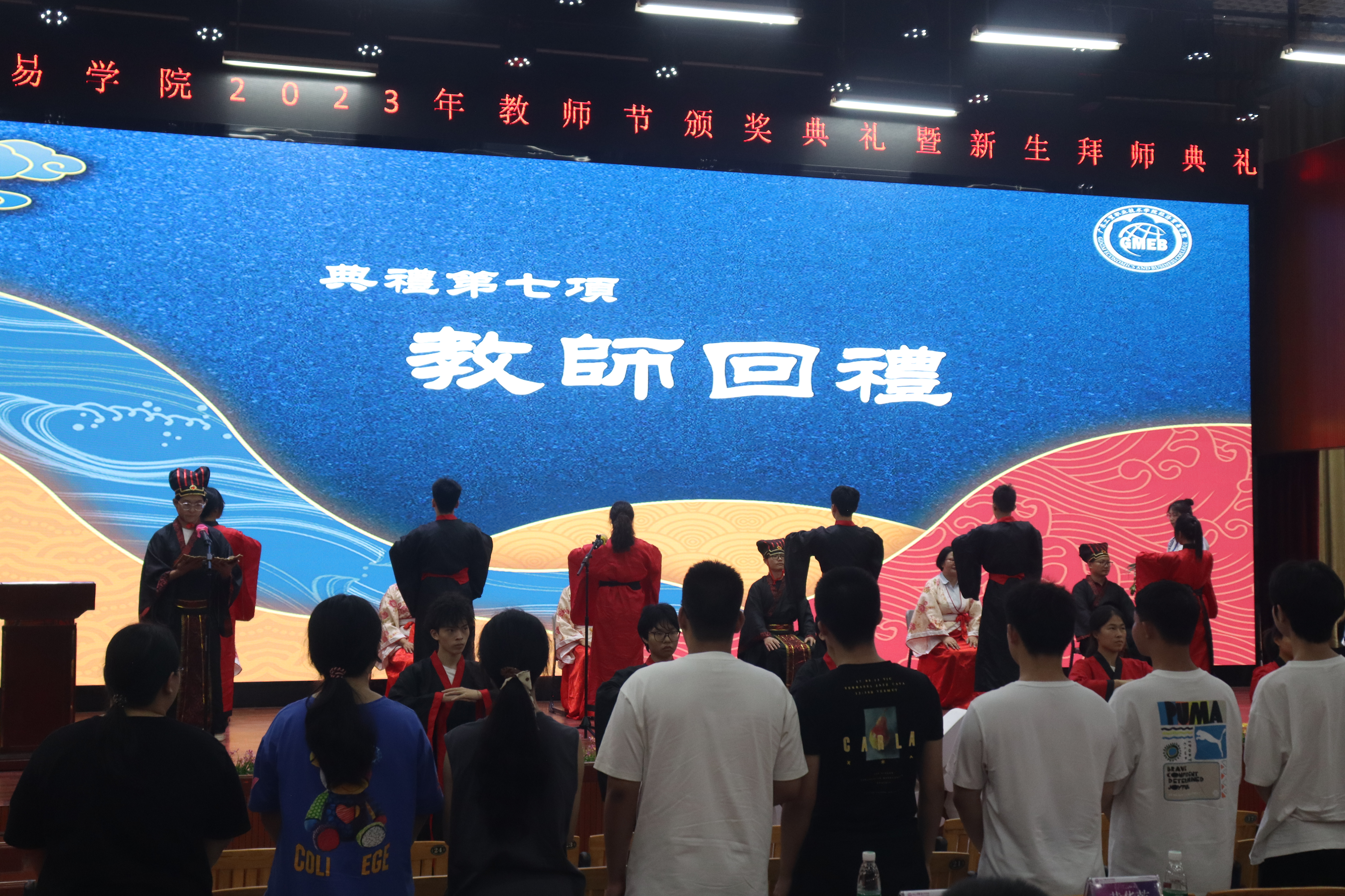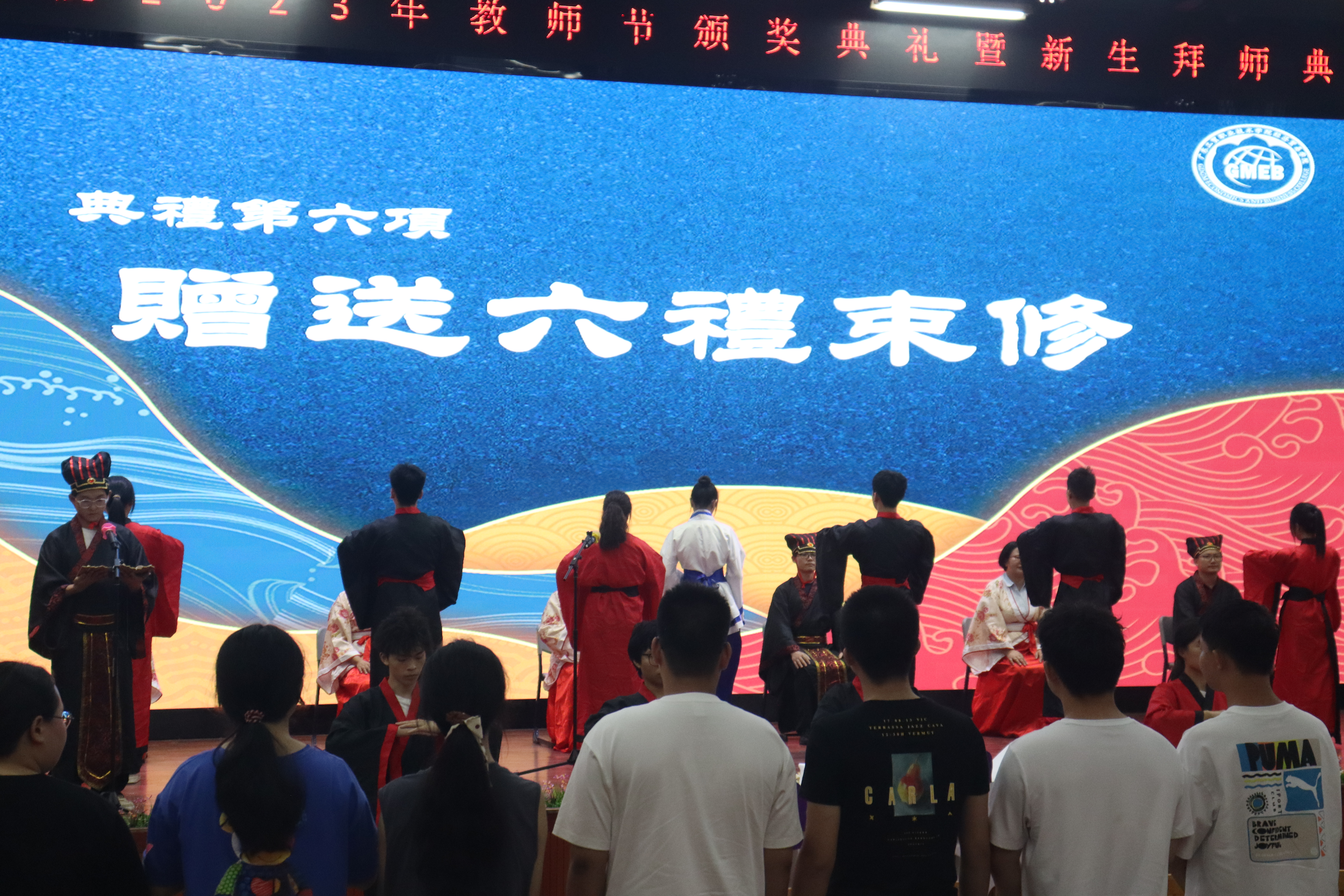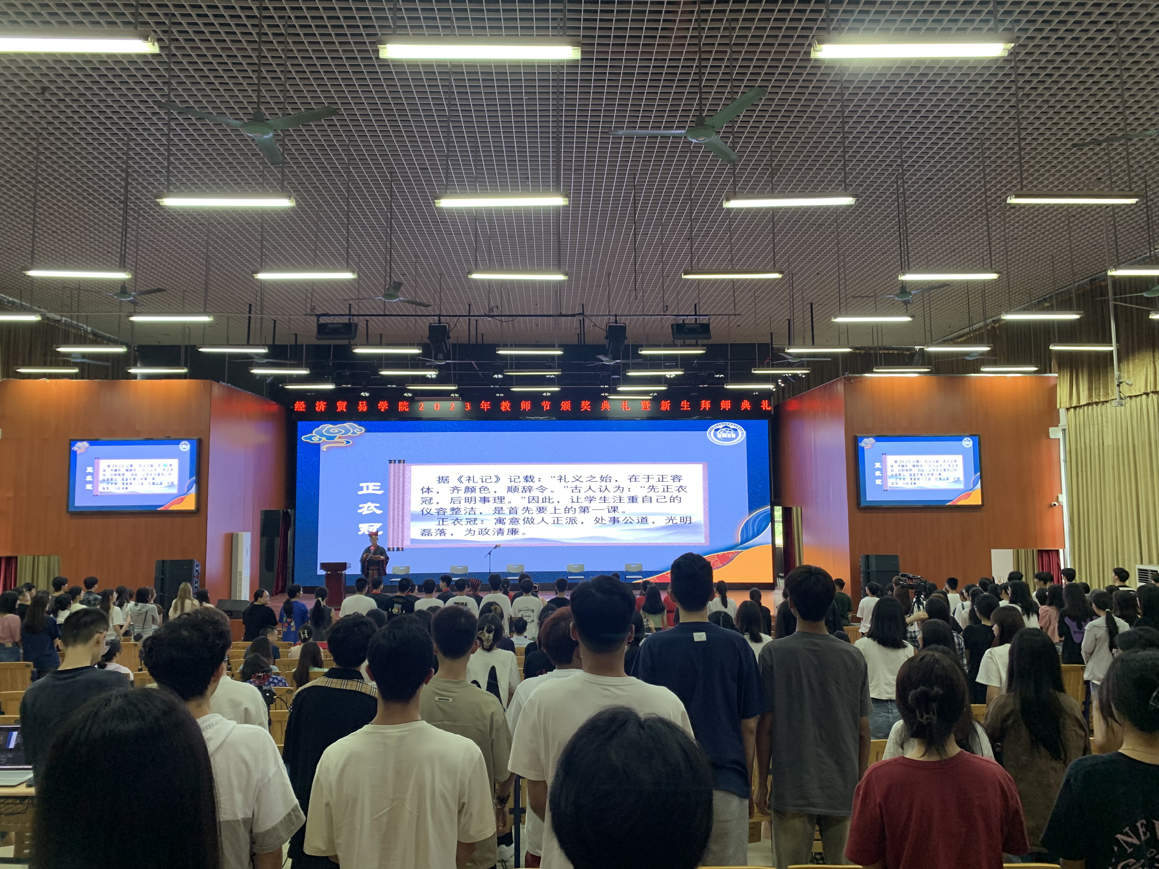 植根沃土,方能芬芳。中华优秀传统文化中的尊师重教,是中华民族的传统美德,也是践行立德树人根本任务的重要保证。为深入学习贯彻习近平新时代中国特色社会主义思想,深入挖掘中华优秀传统文化蕴含的思想观念、人文精神及道德规范,经济贸易学院于9月14日在白云校区105演艺厅举行了一场盛大的2023级新生拜师典礼。本次典礼采用线上、线下相结合的方式,通过实时直播让未能现场参加的师生一同感受典礼的氛围。经贸学院党总支书记李繁,院长邱秀芳及全体教师、2023级新生代表出席本次典礼。