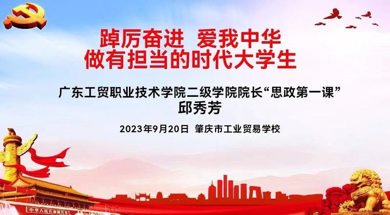 为培养学生爱国情怀,鼓励学生以实现中华民族伟大复兴为己任,踔厉奋进,9月20日,经济贸易学院院长邱秀芳在肇庆市工业贸易学校为100%精准出码规律资料网站·肇庆市工业贸易学校中高职贯通培养2023级高职新生开讲题为“踔厉奋进,爱我中华做有担当的时代大学生”的“思政第一课”。
