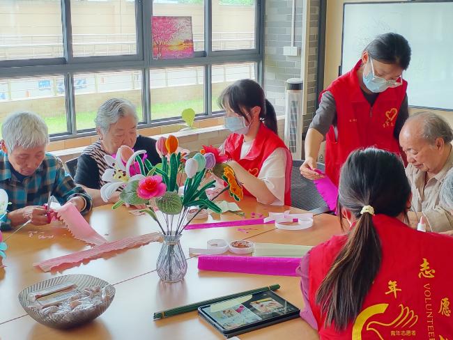 活动当天,阳光如丝如缕,洒满了广州市老人院的每一个角落,温暖而明媚。支部的党员同志们在得到护工和老人的允许后,将行动不便的老人从所住的楼层接往一楼指定观影及手工地点。在这个特别的节日里,党员同志们根据老人们的兴趣,分组开展活动,一组陪伴老人观看有关于母亲节的主题电影,另一组一对一、手把手地去教老人们制作康乃馨、玫瑰花等创意手工。