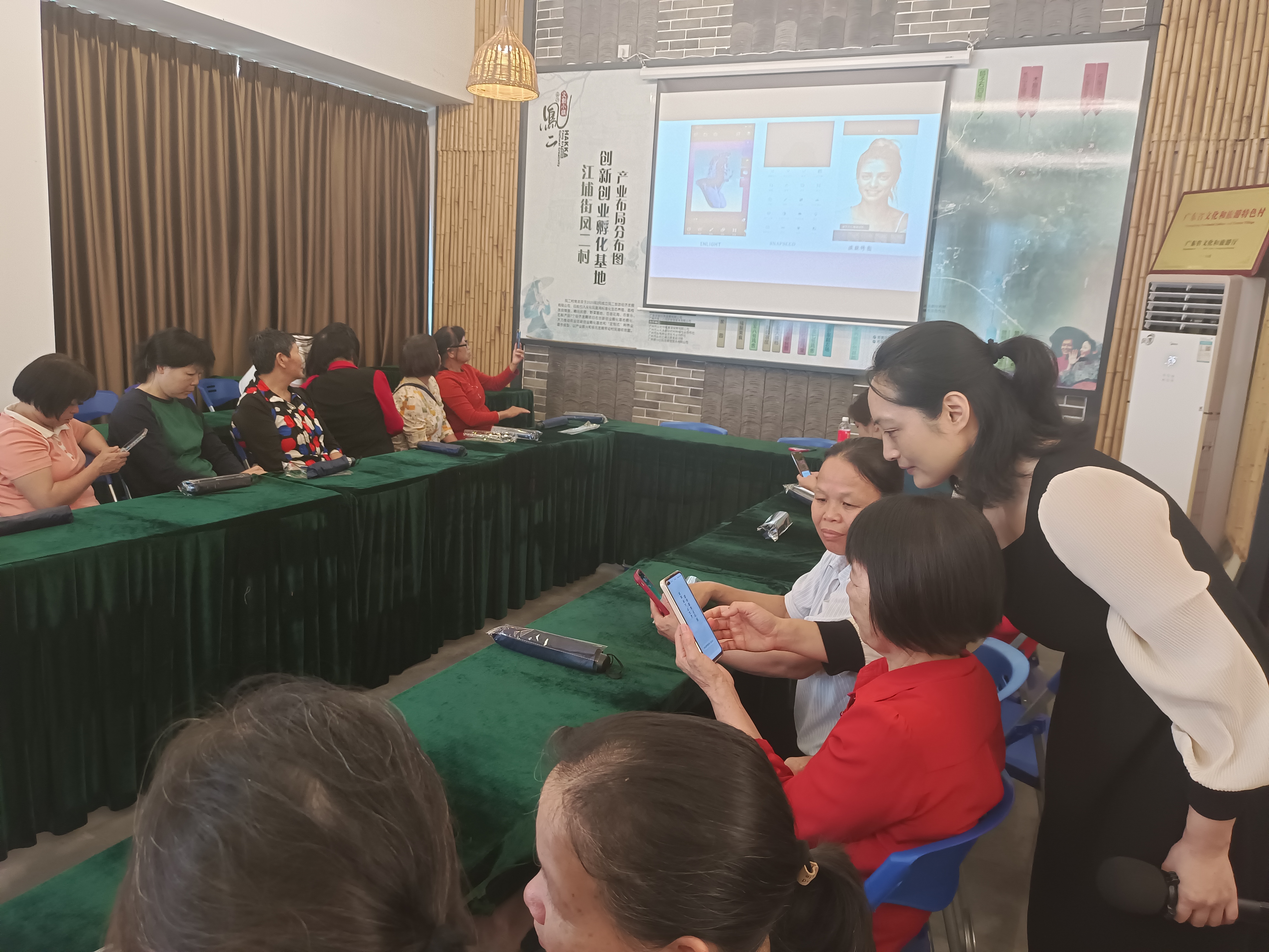 为贯彻落实习近平新时代中国特色社会主义思想,为进一步提升职业院校主动服务国家和区域发展战略的能力,聚焦重点领域、重点人群,精准对接产业发展需求,5月23日上午,“广东工贸—从化江浦街凤二村全媒体助力乡村振兴社区教育示范基地”项目团队开展了“手机摄影职业培训”活动,主题是“小手机大创作,轻松入门课”,该培训活动的目的是培养农村基层人员掌握基本的手机摄影知识、技术,并能把所学技能运用到实际的农产品拍摄中,提高农产品照片的展示效果,助力乡村振兴,拓宽农产品销售渠道,扩大农产品知名度、认可度、美誉度。培训分为理论教学和实践操作两个部分。授课老师陈秋娜从手机基本参数、构图、光线、对焦、后期处理等方面着手讲解,和大家一起分享了手机摄影的一些技巧。实操环节中,村民们争先恐后的对各类农产品进行拍摄,陈老师对大家拍摄的作品进行了点评解答了参训者在摄影实践中遇到的各种问题,让大家受益匪浅。