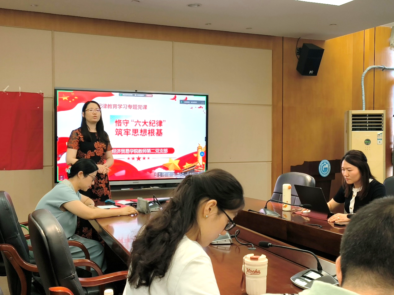 纪律是党的生命线,加强纪律建设是全面从严治党的治本之策。为进一步全面加强党支部的纪律建设,不断深化全体党员教师自我完善、自我革新以及自我提高的能力,推进党规党纪入脑入心,6月25日下午,经济贸易学院教师第二党支部在白云校区明德楼1-201开展党纪学习教育专题活动,党课由教师第二党支部书记蒋晶主讲。