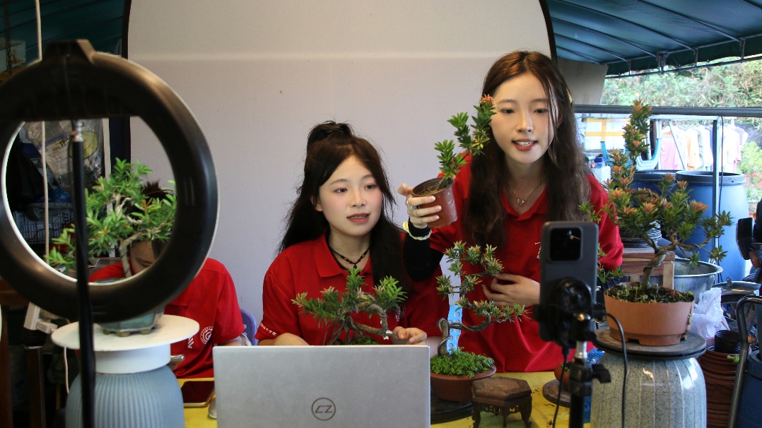 “哈喽哈喽,欢迎宝宝们来到直播间,我们是主播彩艺和周颖,今天我们来到了京彩家庭农场,大家可以看到我们身边有各种品种的罗汉松”。本次活动主播们置身种植基地介绍特色农产品,让网友们可以近距离观赏盆栽,通过主播的讲解进一步了解盆栽。在两个小时的直播中,观看人数近五百人,粉丝数大增,获得农户和广大网友的好评。本次“三下乡”电商直播助农活动中,罗汉松等新村村特色农产品在电商兴农突击队的带动下提升了关注度,农户在队员的帮助下进一步提高了电商知识和技能。