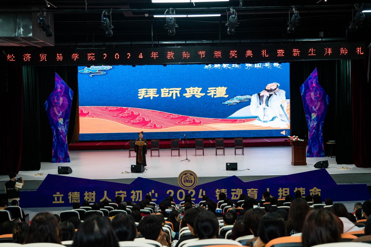 一支粉笔,两袖微尘,三尺讲台,四季耕耘。在这充满诗意与温情的秋色中,我们迎来了全国第40个教师节。为深入学习贯彻党的二十大精神,全面贯彻党的教育方针,聚焦师德建设主题教育月“大力弘扬教育家精神,加快建设教育强国”主题,经济贸易学院于9月24日下午2:10在白云校区学生活动中心演艺厅隆重举行2024年教师节颁奖典礼暨新生拜师典礼。会场内灯光璀璨、座无虚席,学院师生齐聚一堂,共同见证了这一庄重而充满意义的典礼。此次典礼旨在表彰在教育事业中做出突出贡献的教师、为新入职的教师举办“传帮带”仪式,并为新生举行庄严的拜师仪式。经贸学院党总支书记李繁、党总支副书记龚云、副院长蒋晶以及全体教职员工及新生代表近500人参加了本次典礼。