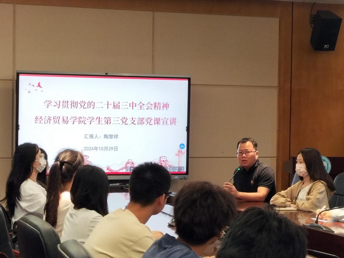 为全面深入学习领会党的二十届三中全会精神,扎实推进学习宣传贯彻工作,2024年10月29日下午,经济贸易学院学生第三党支部书记陶智祥在明德楼1-201组织开展了一场党的二十届三中全会精神宣讲活动。支部全体党员参加了本次宣讲活动,现场学习氛围浓厚。