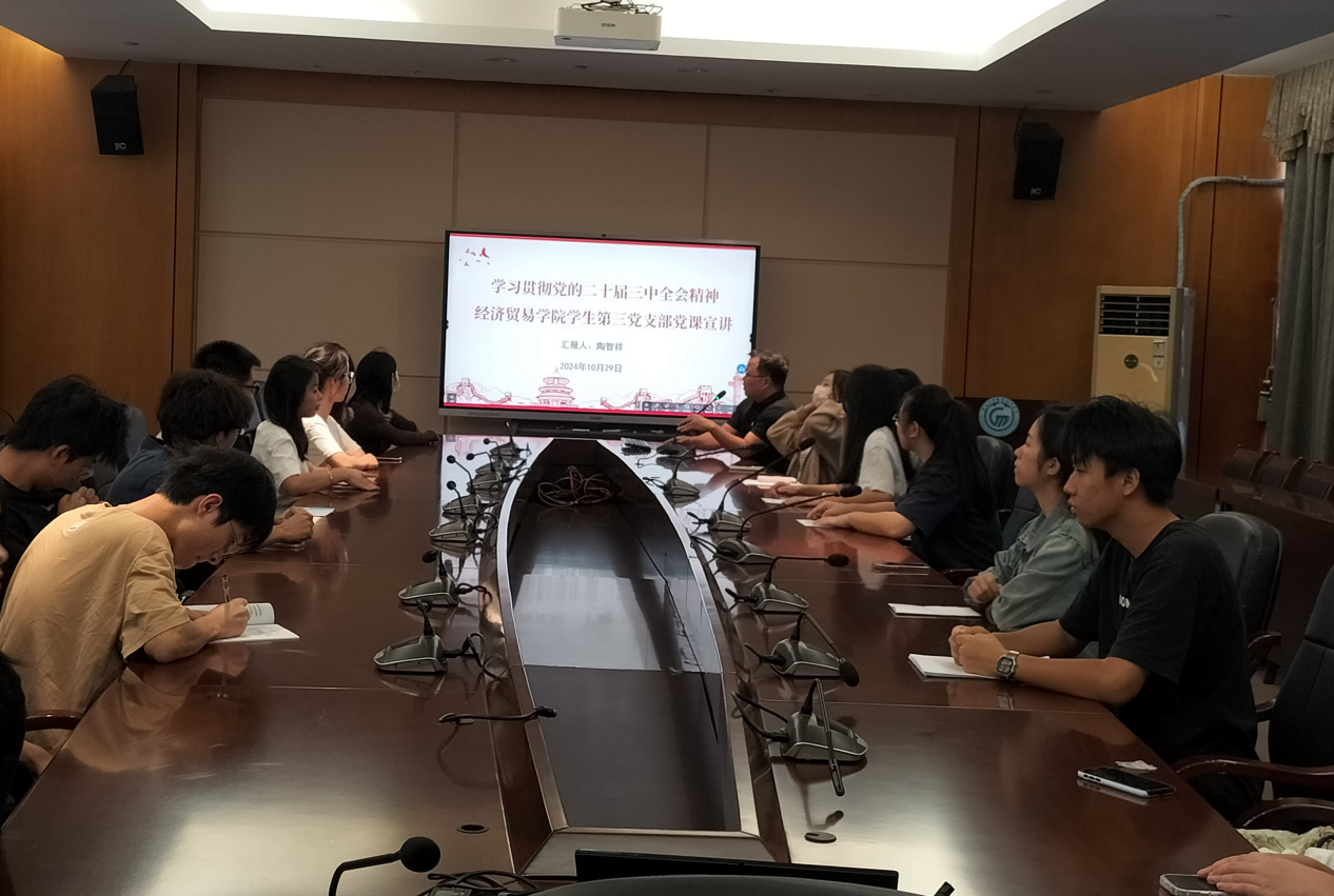 为全面深入学习领会党的二十届三中全会精神,扎实推进学习宣传贯彻工作,2024年10月29日下午,经济贸易学院学生第三党支部书记陶智祥在明德楼1-201组织开展了一场党的二十届三中全会精神宣讲活动。支部全体党员参加了本次宣讲活动,现场学习氛围浓厚。