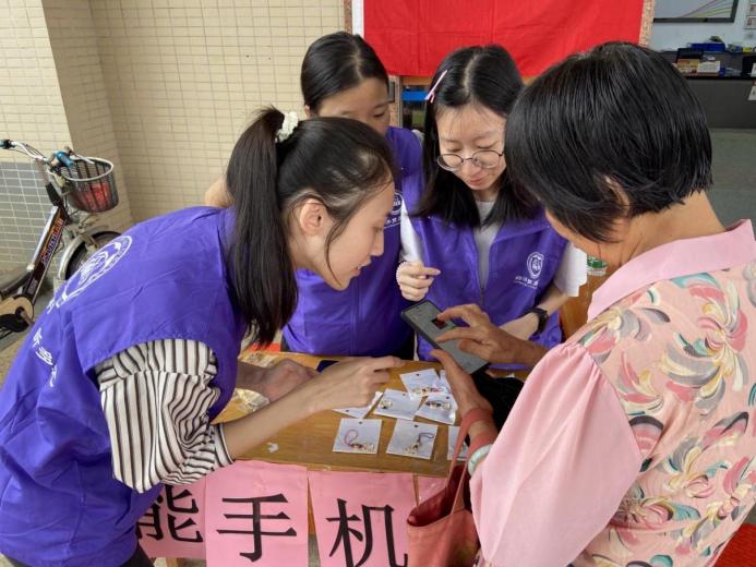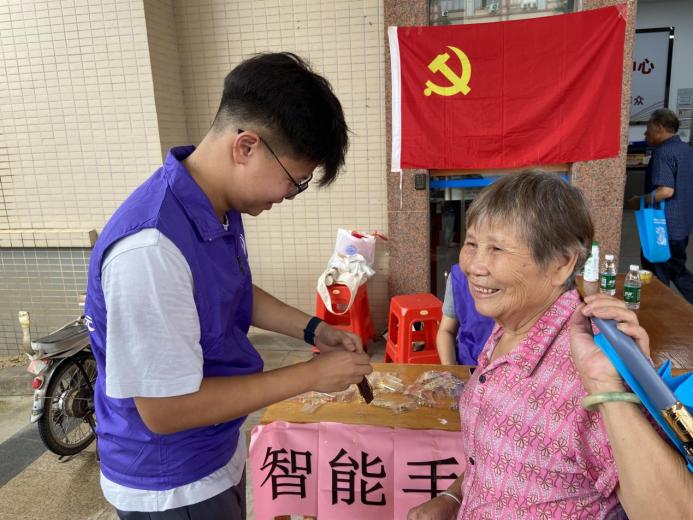 学生党员给老人手机系上挂件