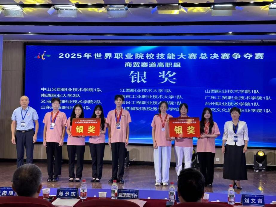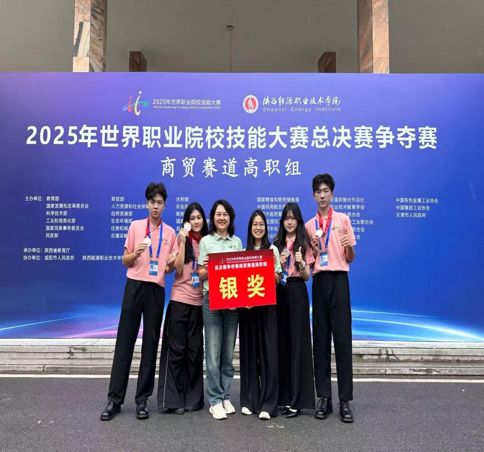 8月27日至28日,2025年世界职业院校技能大赛总决赛争夺赛商贸赛道(高职组)在陕西财经职业技术学院、陕西工业职业技术学院和陕西能源职业技术学院举行。由我校经济贸易学院陈樾兒、陈嘉豪、余文娟、冯浩轩四位同学组成的参赛团队,在廖文芳、杨海娜老师的指导下,凭借出色表现斩获银奖。