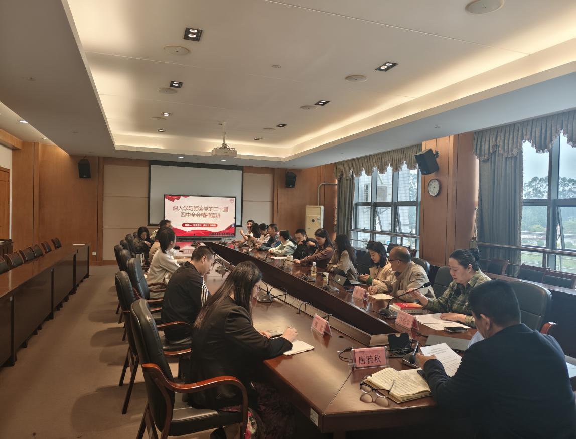 为深入学习贯彻党的二十届四中全会精神,12月1日,学校党委委员、副校长唐毓秋到经济贸易学院党总支宣讲党的二十届四中全会精神。经贸学院全体教师党员参与学习。