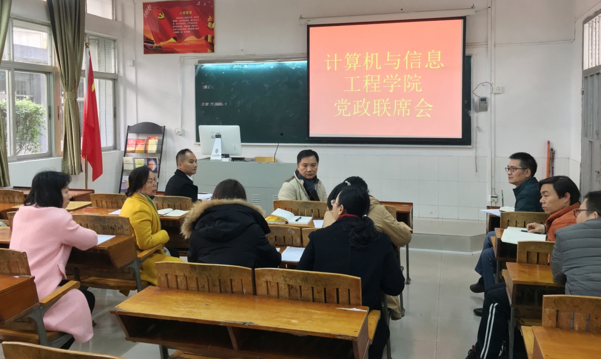1月4日上午,计算机与信息工程学院领导班子就学生休退学情况、寒假学生留宿、二级教学部门绩效考核制定等内容召开了党政联席会议。纪委副书记王刚同志、纪检委员丁妙珍老师、纪检监察处魏惠妮科长旁听并做廉政风险防控排查调研。期间,王刚处长、丁妙珍老师从自身工作实践出发对我院的学生工作提出专业性指导,最后,在“三重一大”事项决策制度方面提出各项会议记录须完整规范有据可查、科研项目的资金使用要从项目立项书源头抓起并建立长效督察机制、教师招聘和人才引进要做到人岗相适、各得其所等建议。
