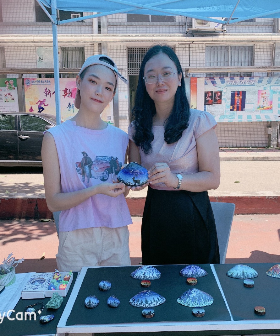 参与此次实践活动的商品可谓是琳琅满目,除了有各种各样的常见物品--水果冰、水果凉粉、携带式小风扇等,还有一些是与学生专业相关的物品,比如说来自18数艺1班的团支书林芝青带来了自己的亲笔力作--水彩贝壳画、水彩石头画和水彩木头画,这些极具有美感的作品立即吸引了无数的眼球,购买者称赞不绝。