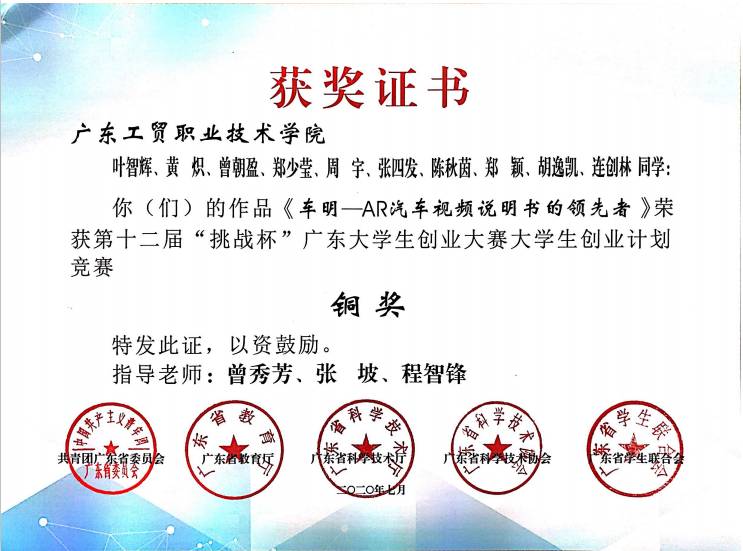 为了在2020年的创新创业比赛中取得好成绩,曾秀芳在2019年5、6月份开设了创新创业学习的晚间兴趣班,同时她也抽时间坚持学习,不断内化自己的创业知识。经过团队一年多的辛苦备战,在学院领导的帮助下,“码上就明”创业比赛团队最终不负众望,获得了2020年“挑战杯”广东大学生创业大赛省级铜奖、“互联网+”大学生创新创业大赛省级铜奖、第六届全国移动互联创新大赛华南赛区决赛省级二等奖和2020年学校的创新创业奖学金的荣誉。
