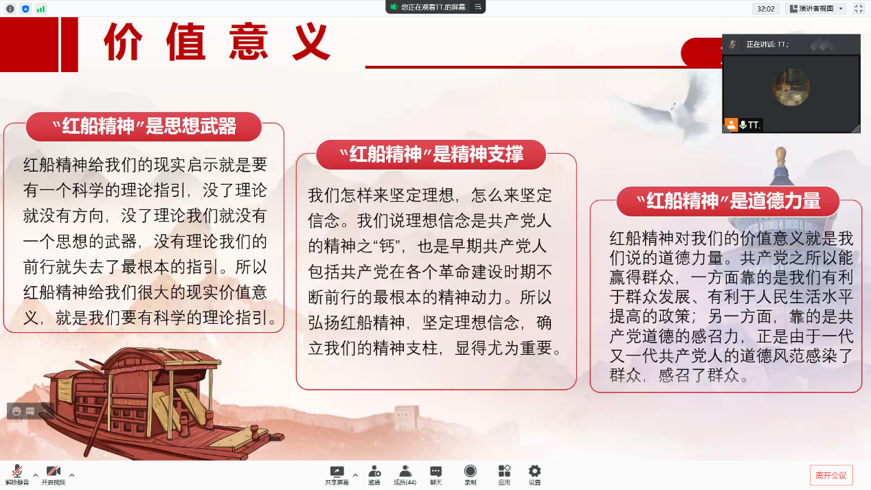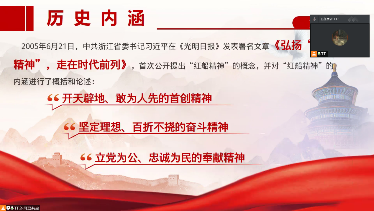 “红船精神”作为革命精神的源头,是初心、也是使命,是历史与现实的回响,更是千帆竞发,百舸争流的发展决心。新时代的青年,有责任也有义务,讲好中国故事,传递中国力量。因此陈婷婷同志带领团支部,从“红船精神”的提出由来、历史内涵、红船代表及当代价值四个部分,走进这艘船,追溯建党初心,不忘初心使命。