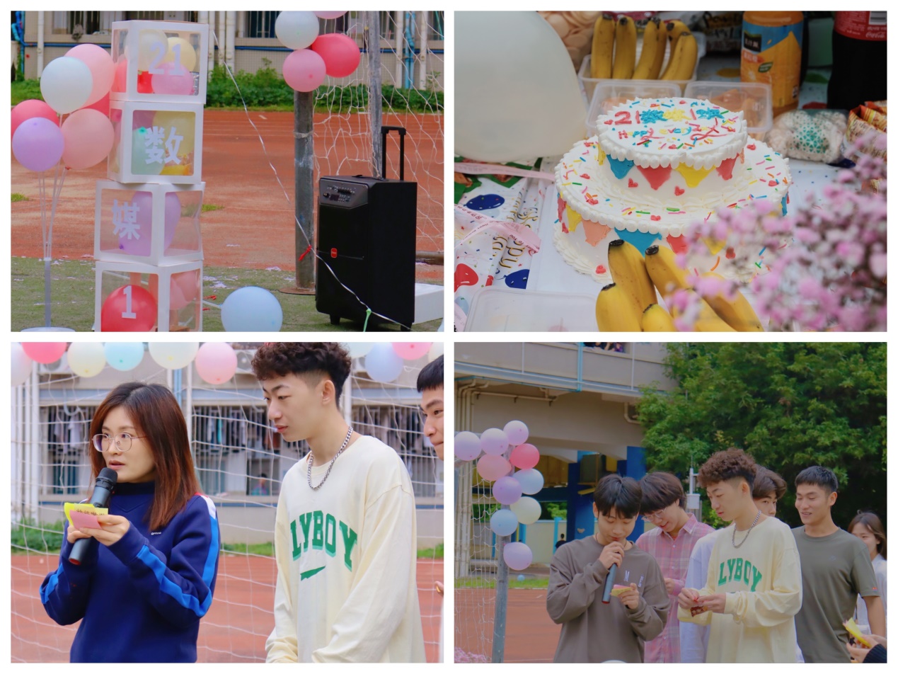 417日下午,计算机学院“班主任工作室”组织21数媒1班举办了一场特别的生日交流会,为本月过生日的6位同学庆生。在绿草茵茵的足球场旁,同学们摆上温馨的蛋糕、共唱生日歌、表演舞蹈、互送祝福心语,这场别开生面、仪式感十足的生日会,让全班23名同学感受到了满满的幸福感。