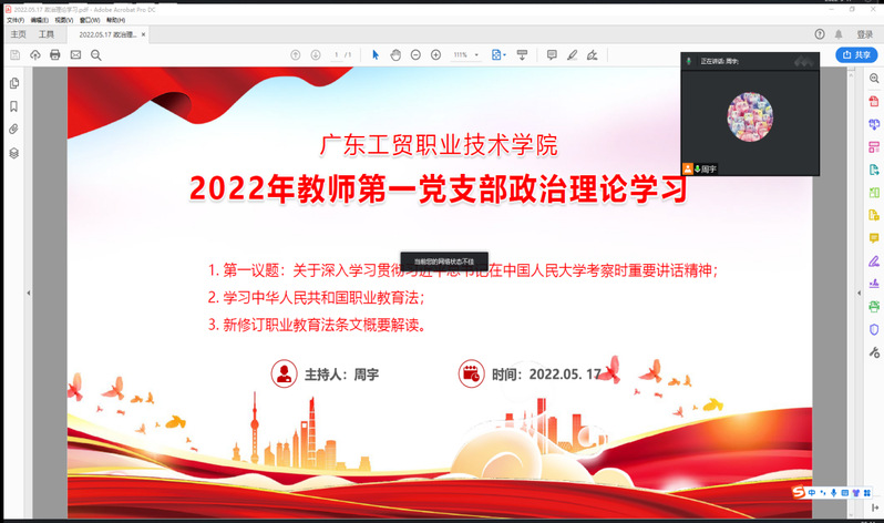 517日,计算机与信息工程学院教师第一党支部召开政治理论学习会,学习习近平总书记在中国人民大学考察时重要讲话精神以及《中华人民共和国职业教育法》。会议由教师第一党支部书记周宇主持。