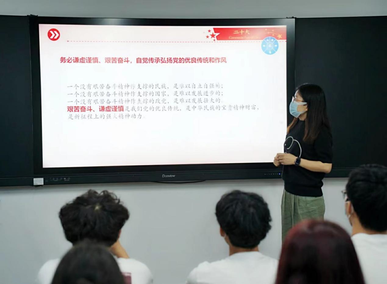 宣讲会上,俞雪娇以《牢记“三个务必” 奋力谱写新时代绚丽华章》为题,围绕党的二十大报告中“三个务必”,和同学一起深入学习了“三个务必”的具体内容和意义。习近平总书记在党的二十大报告中强调:“全党同志务必不忘初心、牢记使命,务必谦虚谨慎、艰苦奋斗,务必敢于斗争、善于斗争,坚定历史自信,增强历史主动,谱写新时代中国特色社会主义更加绚丽的华章。”这一重大论断是对全党提出的“赶考”新要求,彰显了我们党在新征程上管党治党、兴党强党的高度清醒和战略自觉。在和同学们的学习讨论中,俞雪娇说到,“务必不忘初心、牢记使命,我们要始终坚定理想信念;务必谦虚谨慎、艰苦奋斗,我们要自觉传承弘扬党的优良传统和作风;务必敢于斗争、善于斗争,我们要坚定信心、迎难而上、敢于斗争,经受住了来自不同方面的风险挑战考验,踔厉奋发赢得未来。”